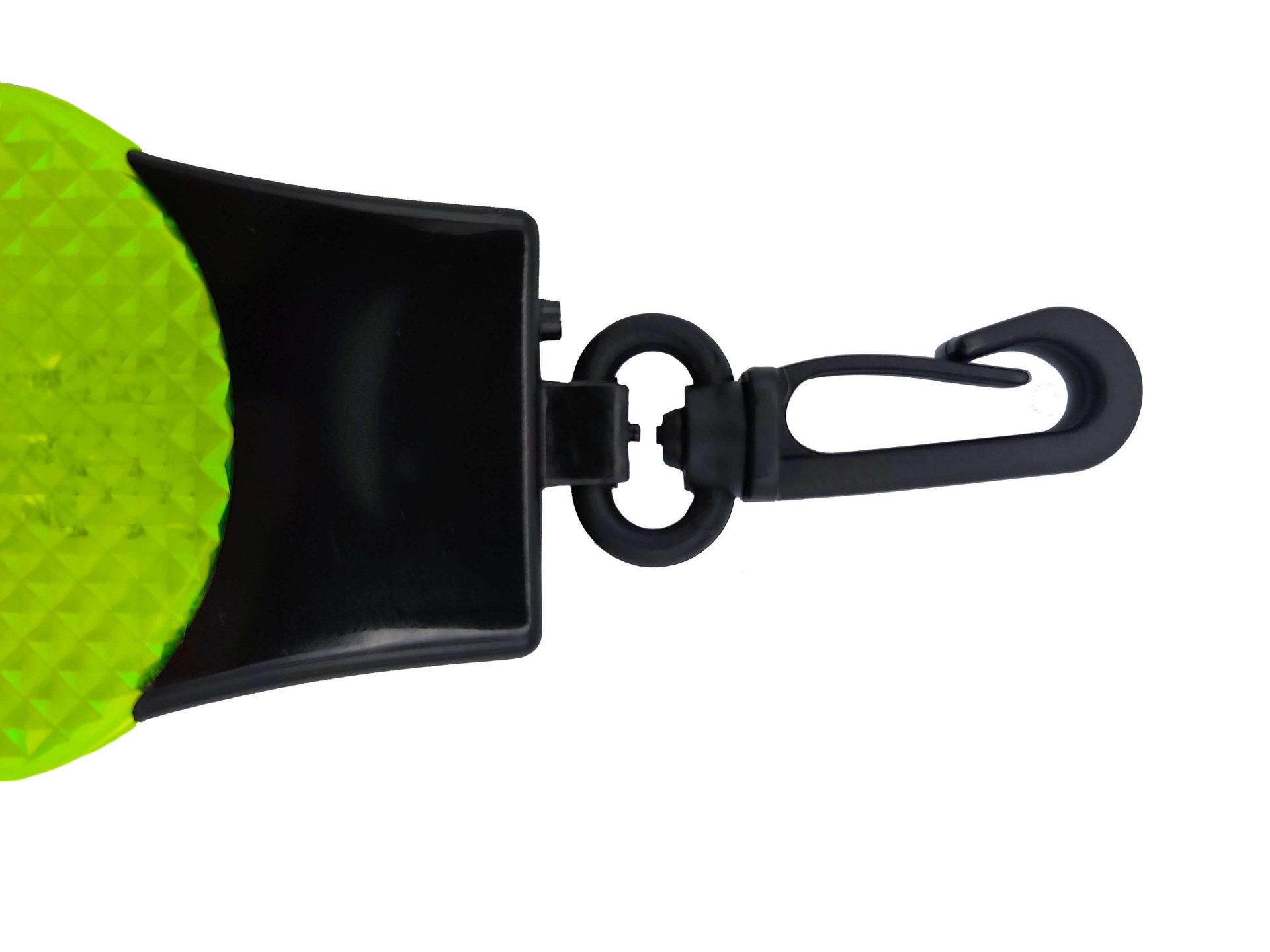 Plastikowy karabińczyk umożliwia szybkie przypięcie odblasku w dowolnym miejscu.