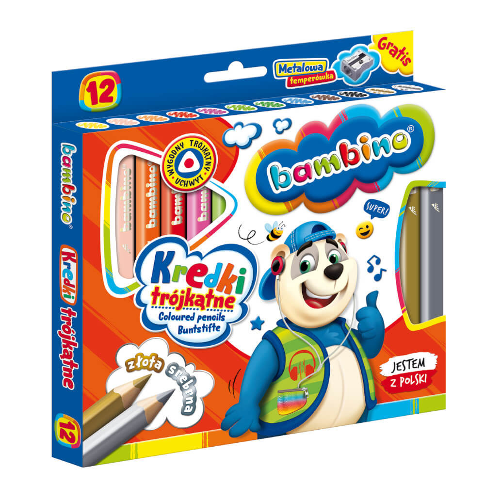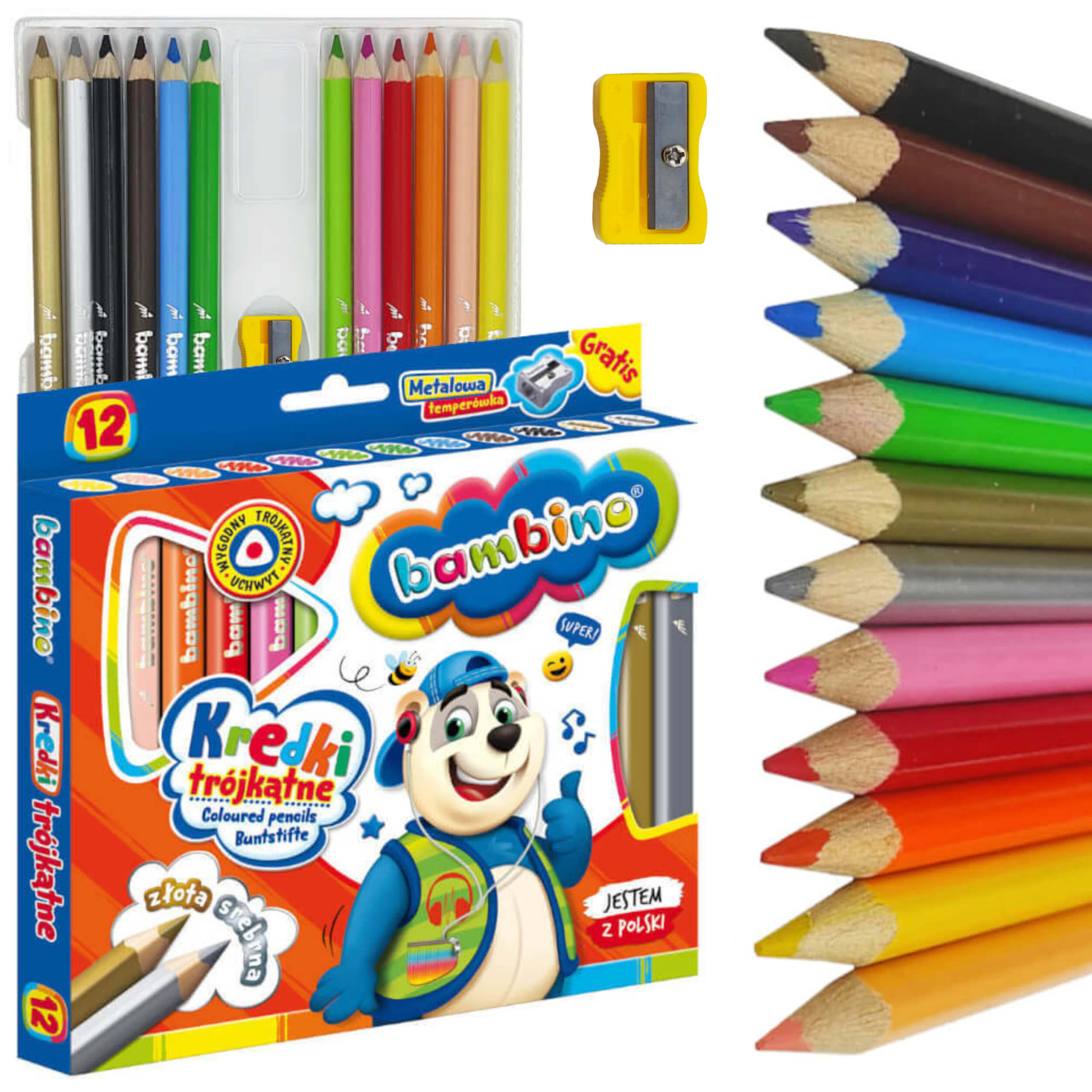 Kredki ołówkowe trójkątne grube JUMBO 12 kolorów +temperówka BAMBINO