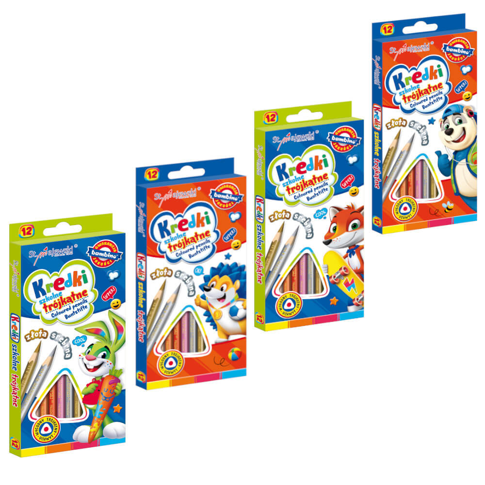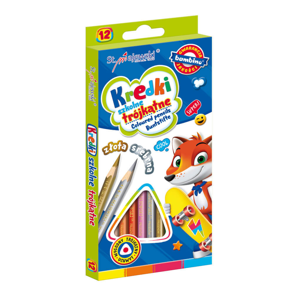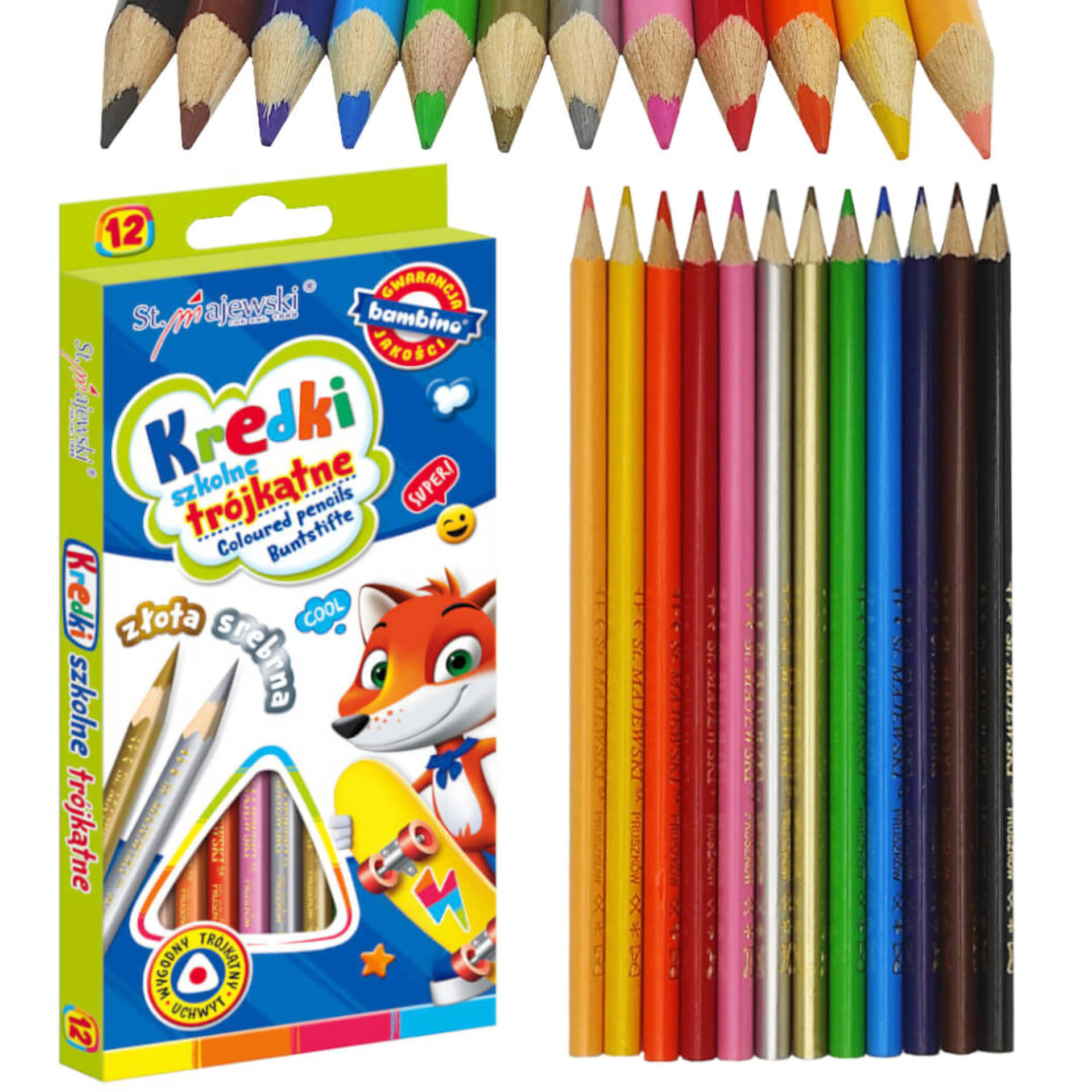 🖍️ Kredki szkolne trójkątne BAMBINO – 12 kolorów, w tym złota i srebrna