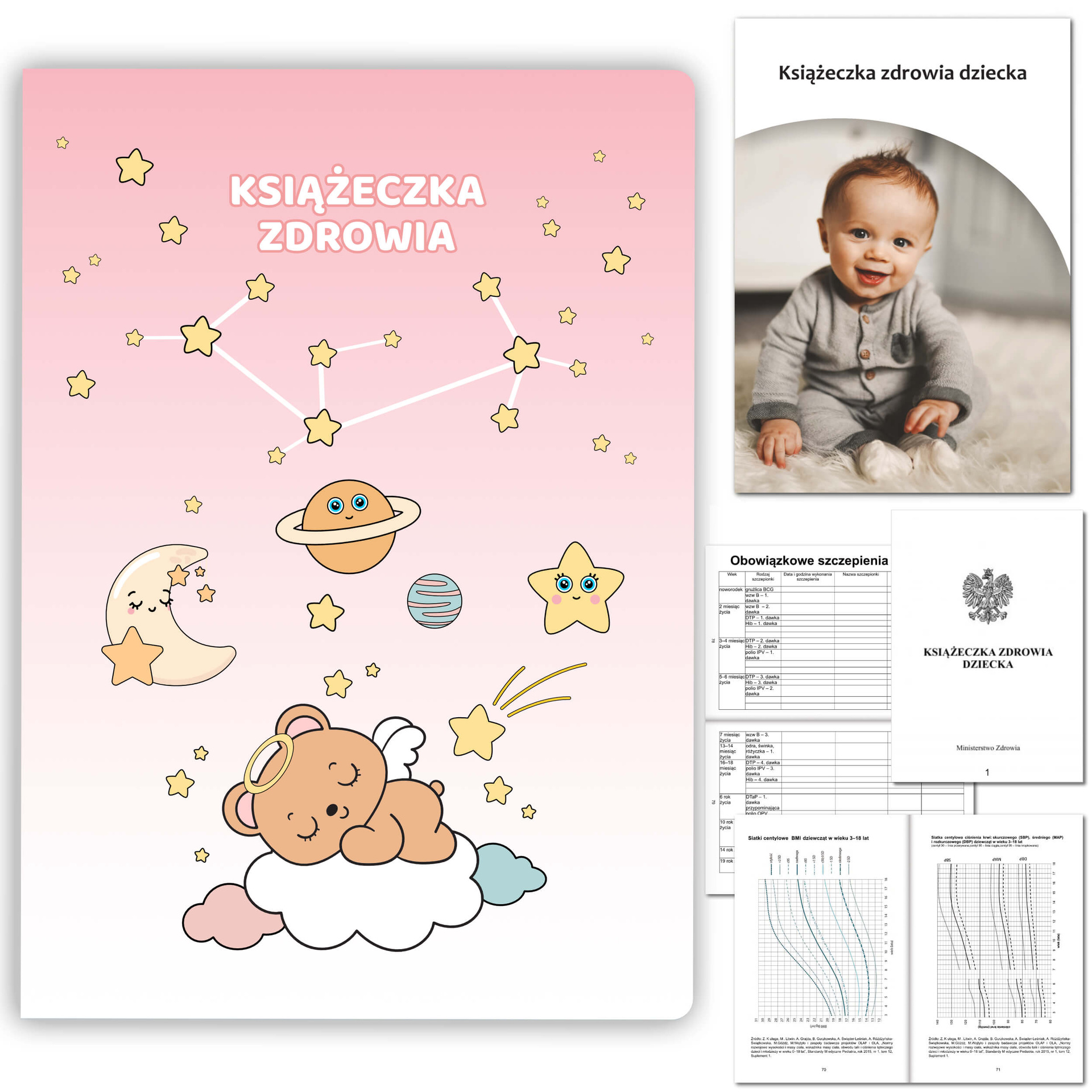 - Zawiera Książeczkę Zdrowia Dziecka i Książeczkę Szczepień