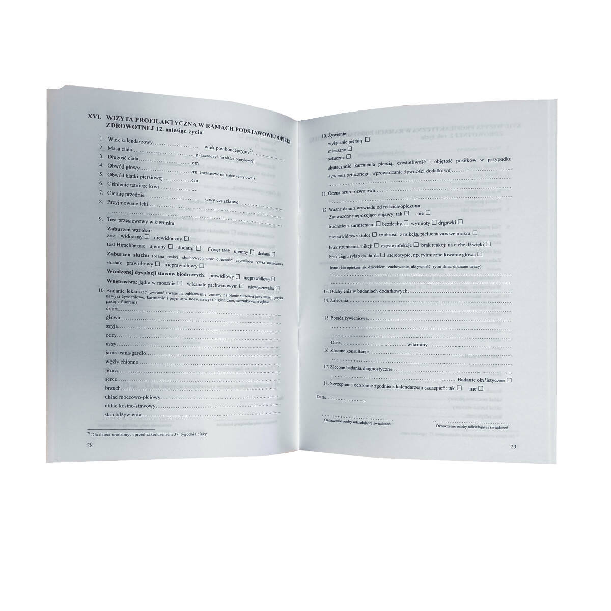 - Miękka okładka w oprawie zeszytowej, zawiera 76 stron: Książeczka Zdrowia Dziecka (66 stron) i Książeczkę Szczepień (10 stron)