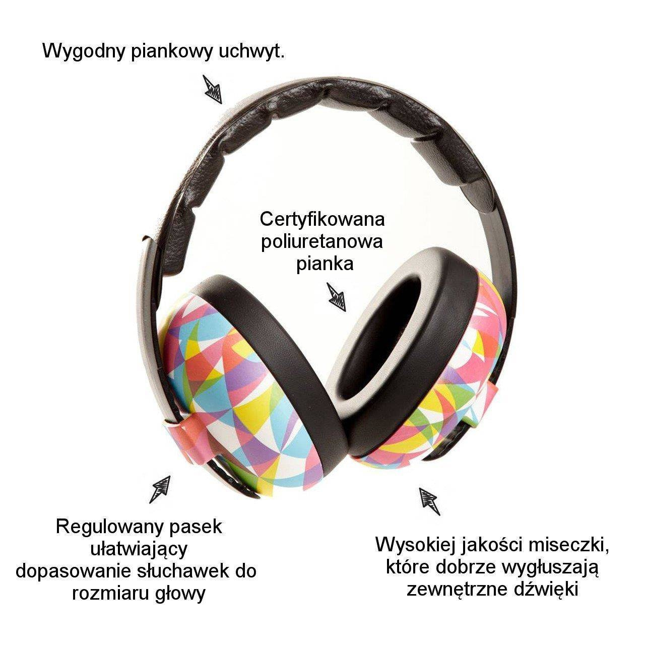 - Produkt ten służy włącznie do ochrony słuchu dzieci - słuchawki te nie generują żadnych dźwięków, więc nie można podłączyć ich do smartfonu czy odtwarzacza mp3.