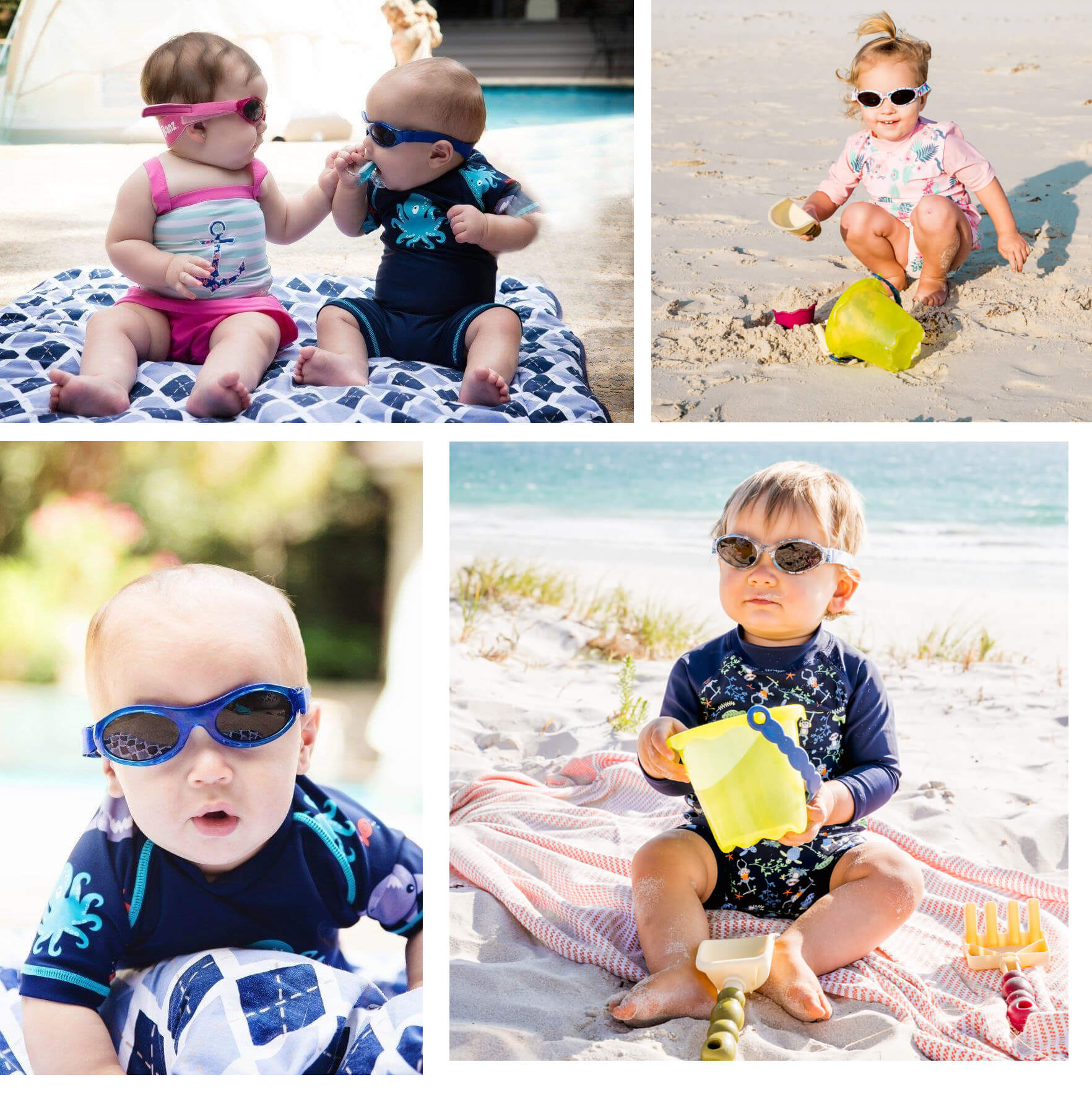 - Specjalny kształt paska (szerszy z tyłu) gwarantuje, że okularki nawet biegającemu po plaży maluchowi okularki nie będą spadać.