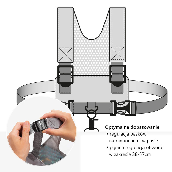 - Duża powierzchnia i zaokrąglony kształt sprawiają, że szelki nie spowodują otarć ani dyskomfortu dziecka
