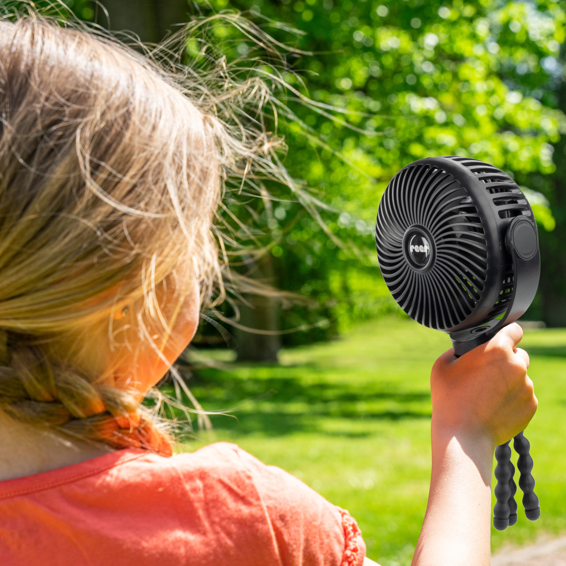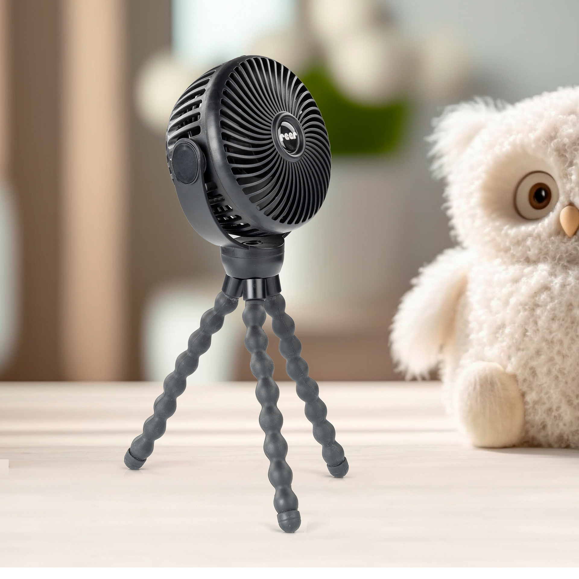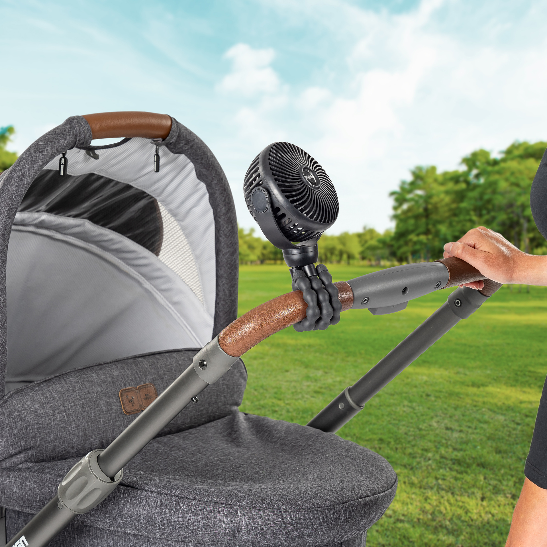 Dzięki elastycznym, antypoślizgowym nogom statywu możesz dostosować wentylator do swoich potrzeb. Elastyczne nóżki umożliwiają postawienie wentylatora na dowolnej (nawet nierównej) powierzchni jak i bezpieczne przymocować do wózka, łóżeczka dziecięcego i wielu innych. To sprawia, że jest idealnym towarzyszem w ciepłe dni - w drodze, w samochodzie czy w domu