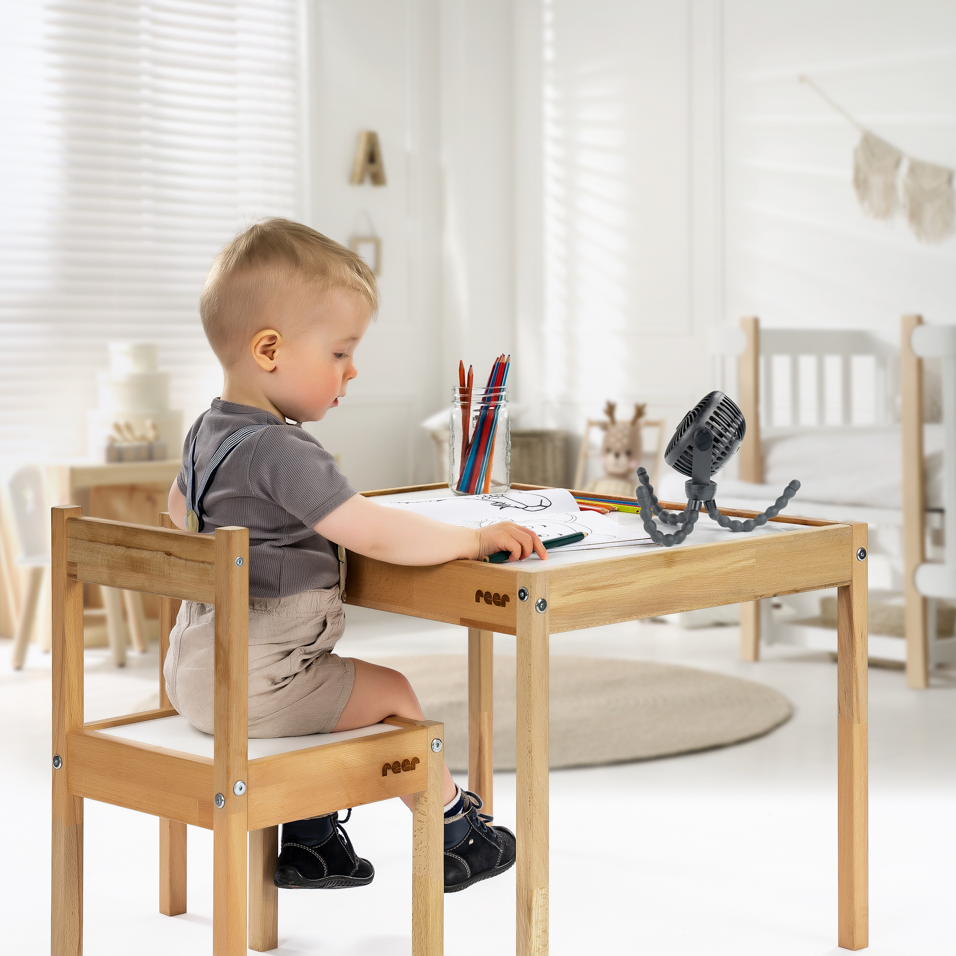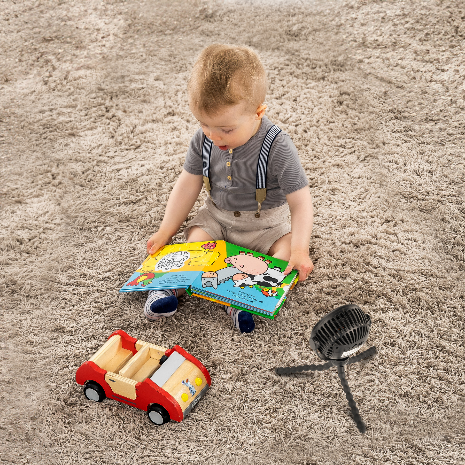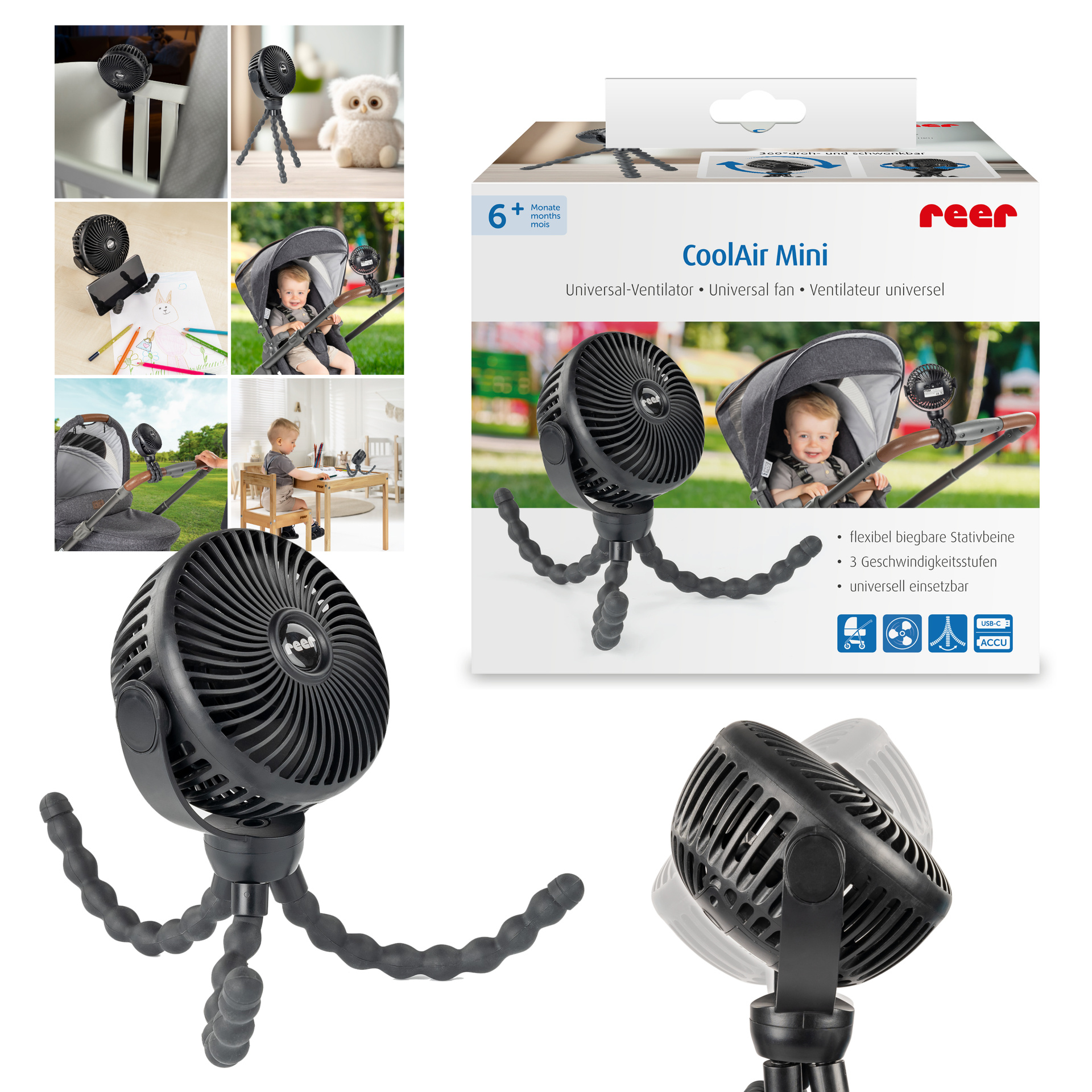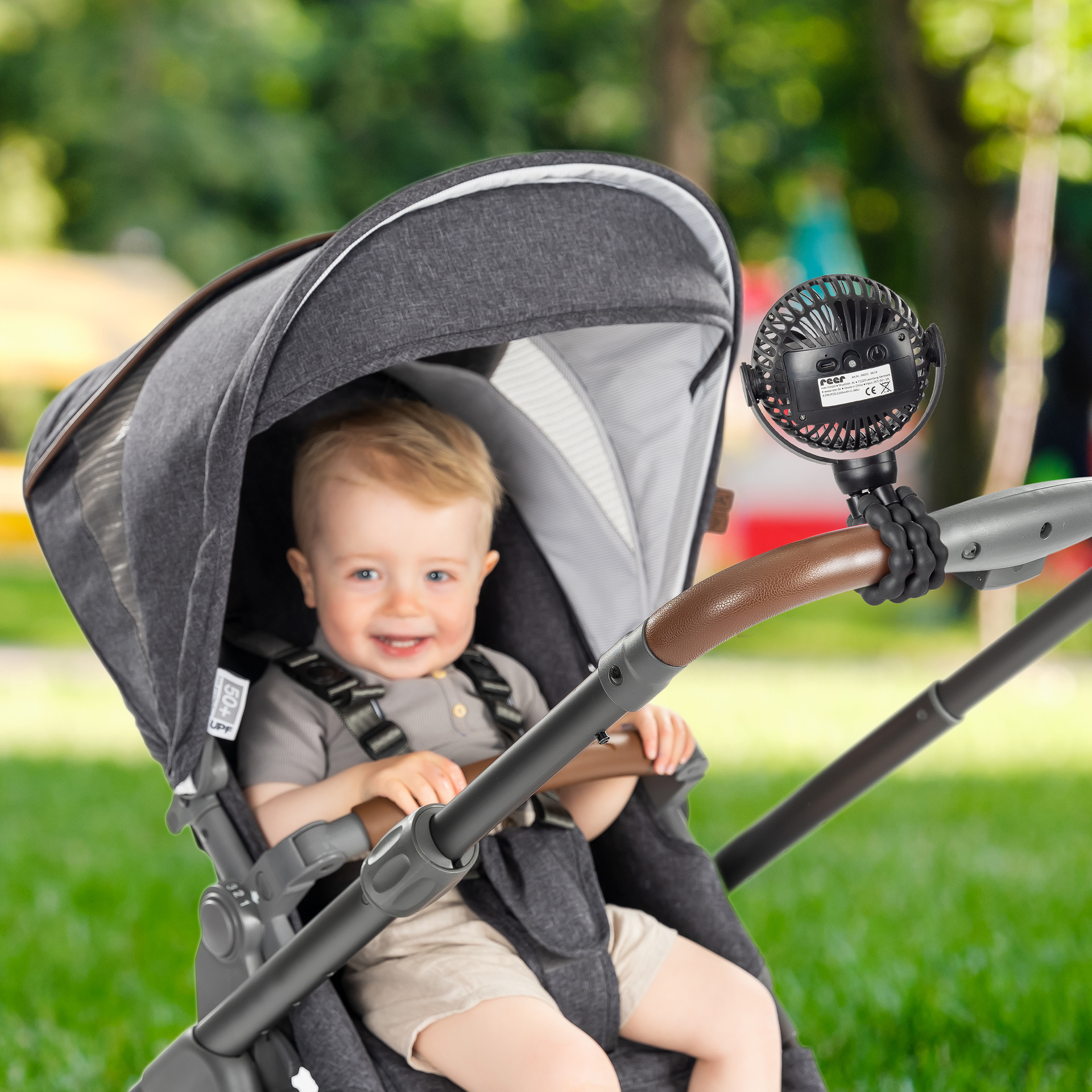 Dzięki elastycznym, antypoślizgowym nogom statywu możesz dostosować wentylator do swoich potrzeb. Elastyczne nóżki umożliwiają postawienie wentylatora na dowolnej (nawet nierównej) powierzchni jak i bezpieczne przymocować do wózka, łóżeczka dziecięcego i wielu innych. To sprawia, że jest idealnym towarzyszem w ciepłe dni - w drodze, w samochodzie czy w domu