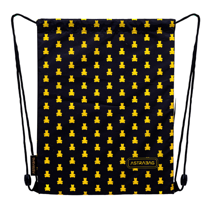 Stylowy worek AstraBag z kolekcji Golden Teddy to praktyczne rozwiązanie do szkoły i na co dzień. Czarne tło w połączeniu z subtelnym wzorem żółtych misiów tworzy nowoczesny, młodzieżowy design, który pasuje do każdego outfitu!