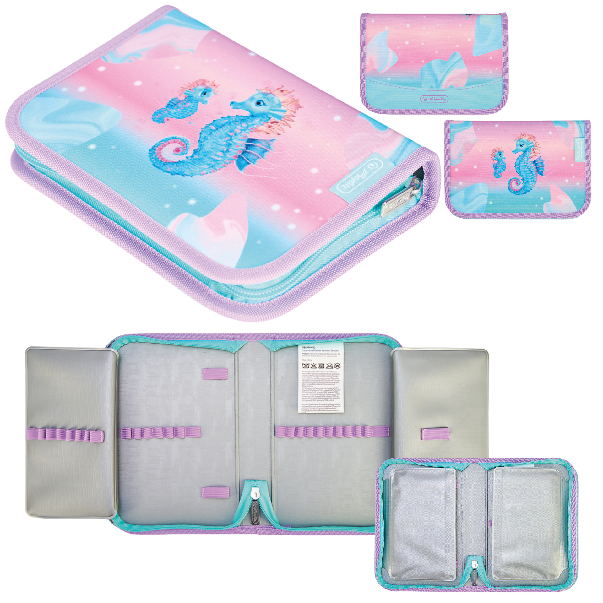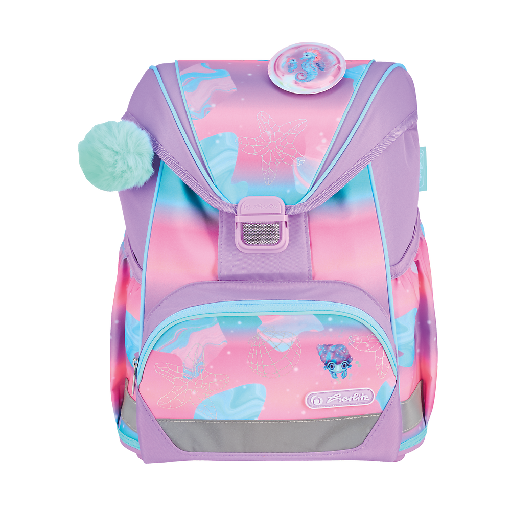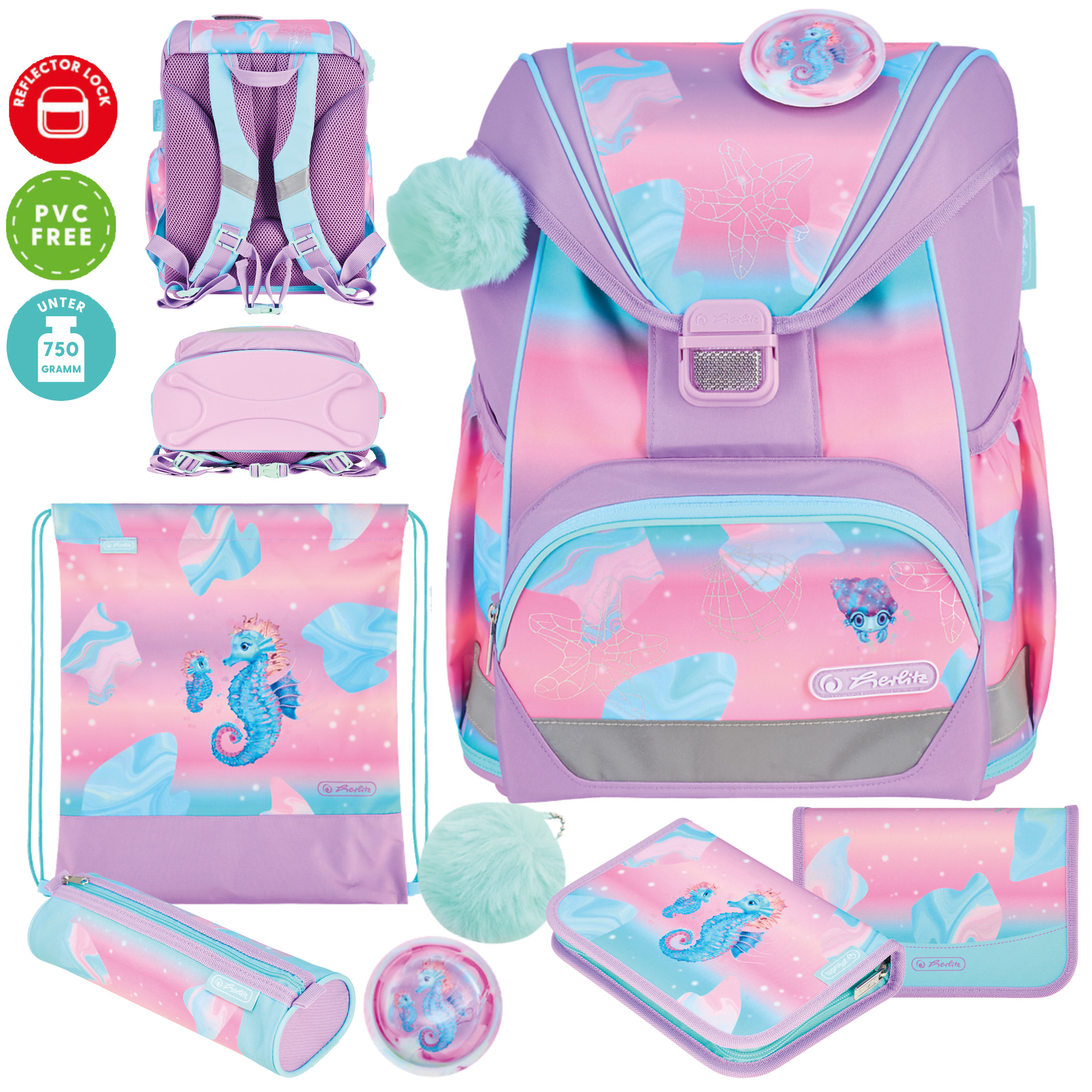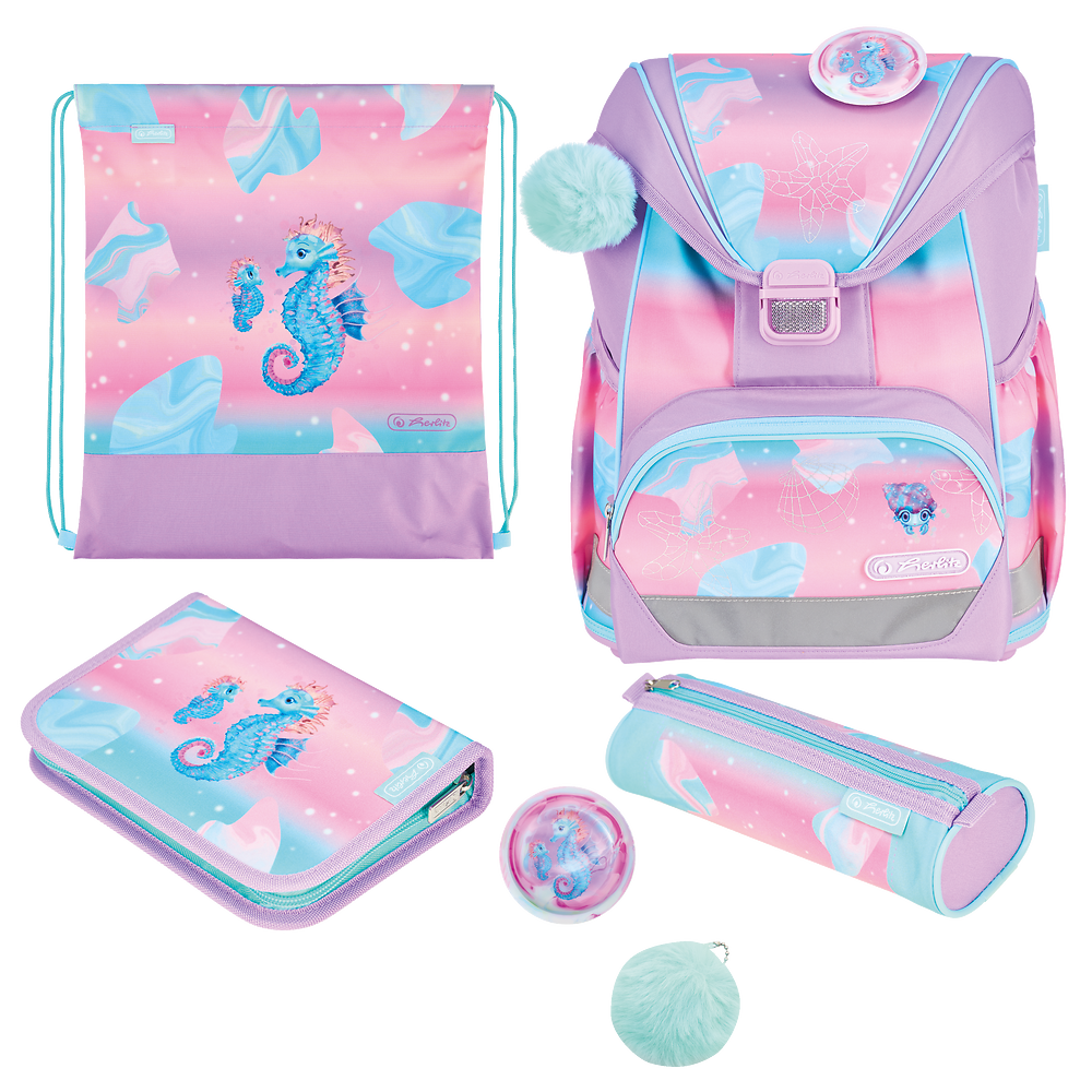 Zestaw szkolny Herlitz Ultralight Plus Ocean Lights to lekki i funkcjonalny komplet dla ucznia klas 1–3, wyróżniający się uroczym motywem koników morskich. Zestaw zawiera tornister, dwa piórniki i worek, a także dodatki – puszysty brelok i plakietkę, które dodają całości wyjątkowego charakteru. Idealny wybór na dobry start szkolnej przygody!