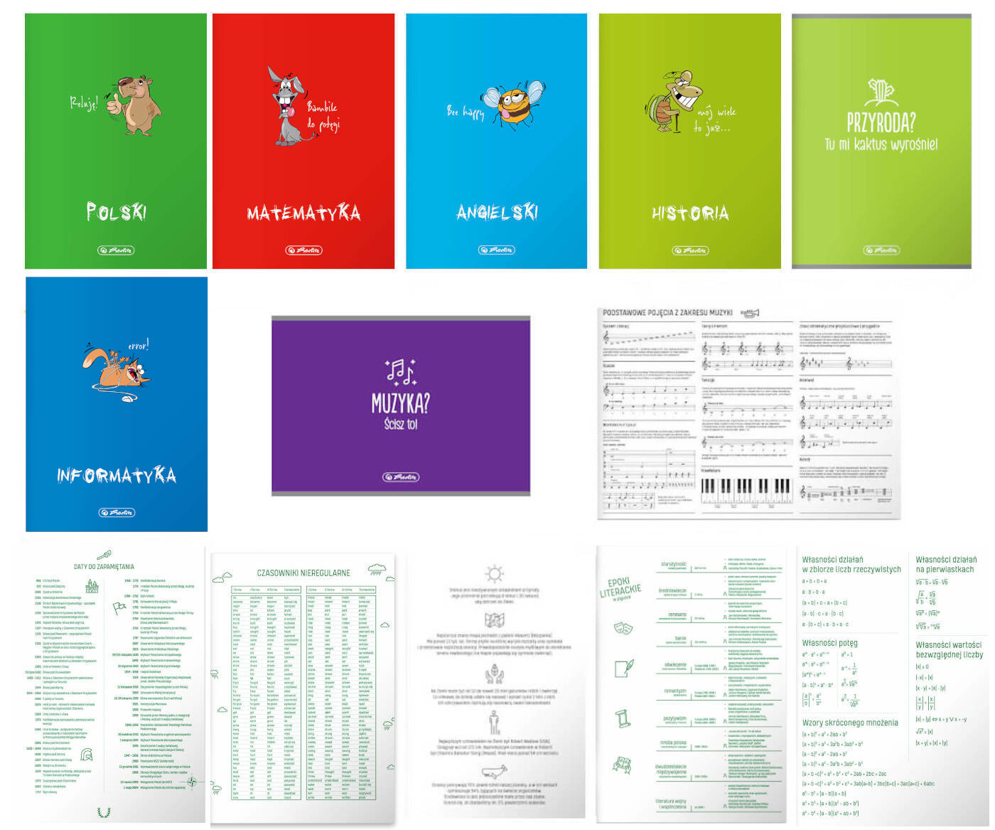 • Okładki z piktogramami oznaczającymi dany przedmiot, dzięki którym łatwiej jest znaleźć w plecaku dany zeszyt