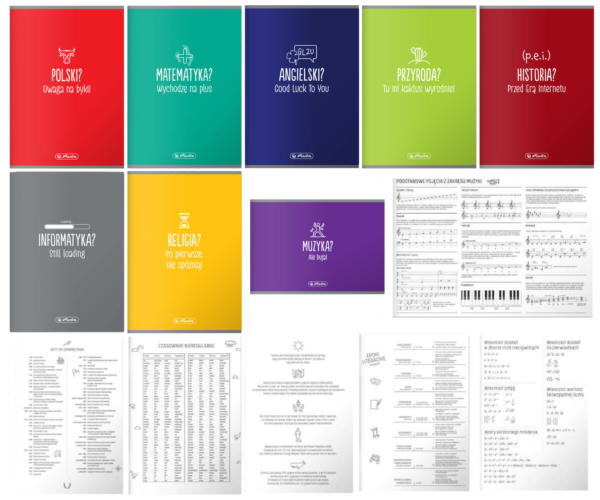 - Okładka typu soft-touch z piktogramem oznaczający dany przedmiot, dzięki którym łatwiej jest znaleźć w plecaku dany zeszyt
