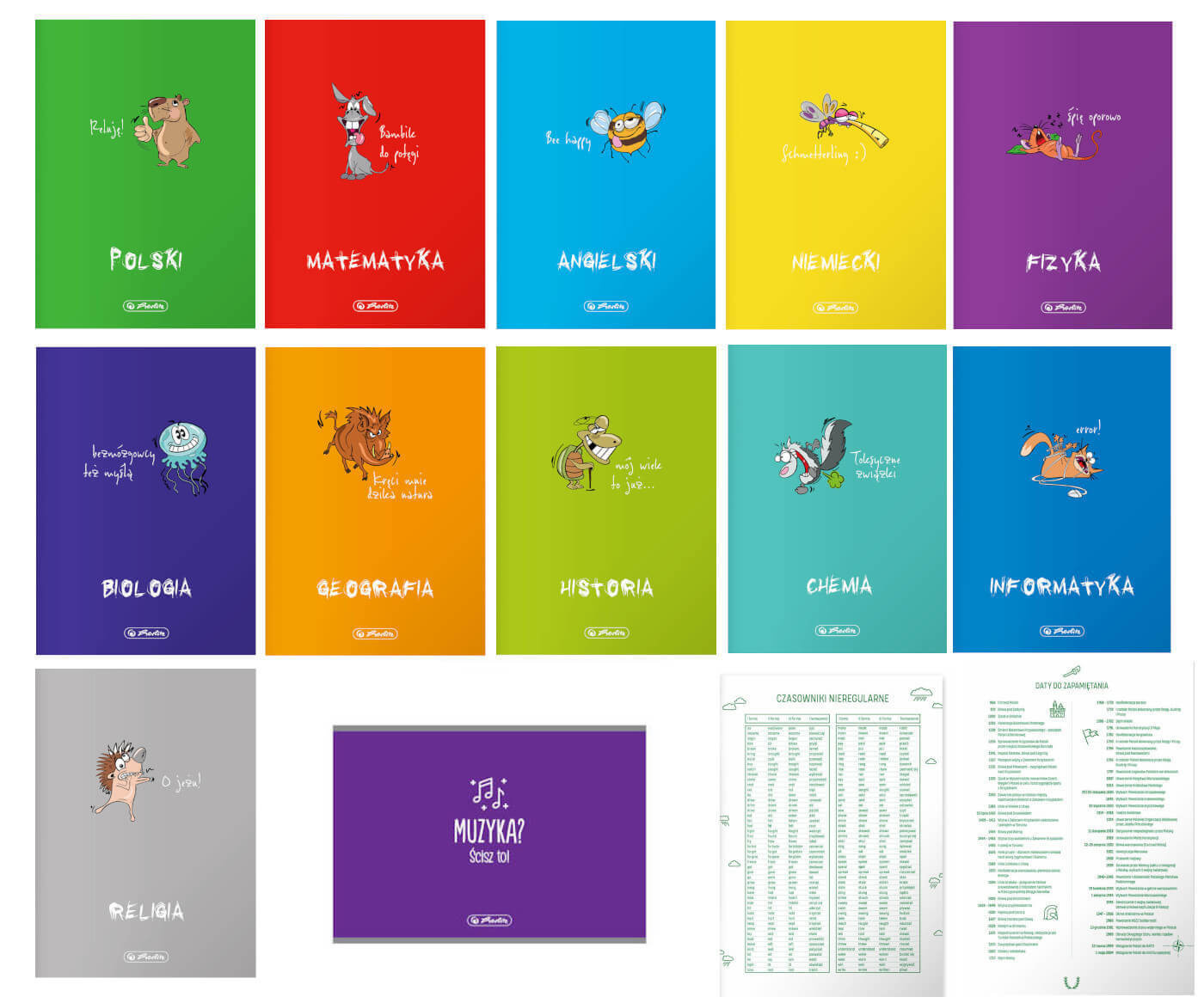 - Okładki z piktogramami oznaczającymi dany przedmiot, dzięki którym łatwiej jest znaleźć w plecaku dany zeszyt